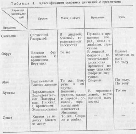 Выполнение упражнений с предметами придает большую эмоциональность и насыщенность занятиям. Они позволяют развивать подвижность лучезапястного, локтевого, плечевого суставов, развивать силу мелких групп мышц плечевого пояса, совершенствовать координацию движений. Классификация основных движений с предметами представлена в табл. 4. Наиболее характерными структурными движениями являются броски, махи, круги и каты. При выполнении упражнений в парах, тройках, в групповых комбинациях помимо приведенных движений возможны передачи, переброски, перекаты предмета друг другу. Для упражнений с мячом характерна мягкость движений, округлость форм, слитность и плавность перехода от одного движения к другому. В упражнении с мячом исключается жесткий захват предмета, поэтому все приемы мяча сопровождаются выраженной фазой амортизации, пальцы кисти, удерживающей мяч, при этом сомкнуты. При выполнении бросков обращается внимание на согласован-