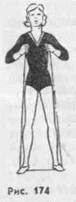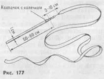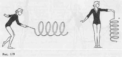 На занятиях художественной гимнастикой используются резиновые мячи диаметром 15—18 см, а также 20 см. Упражнения со скакалкой способствуют развитию скоростно-силовых качеств, выносливости. Скакалка — мягкий предмет, что определяет специфику работы с ней. Возможно применение веревочной скакалки, что позволяет выполнять броски, различного рода переводы. Необходимый размер скакалки определяется следующим образом: в стойке ноги врозь скакалка натягивается до подмышечных впадин (рис. 174). Наиболее характерными движениями со скакалкой являются прыжки через нее. Вращение скакалки осуществляется кистями рук при относительно жест-коп фиксации в локтевых суставах. Для снижения В2