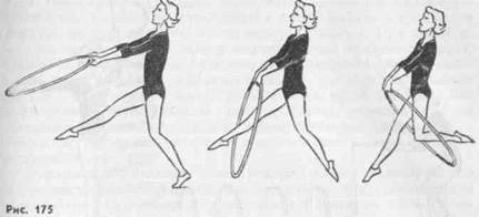 метом возможно целенаправленно развивать физические качества, воспитывать точность двигательных действий, подвижность влучеза-пястных, плечевых суставах. Одним из важных технических приемов владения обручем является правильный хват. Маховые движения, вращения обруча, как скакалки, выполняются в жестком хвате (рис. 175). Свободный хват применяется при различного рода вращениях обруча на руке (рис. 176). Обе формы хвата технически связаны. Упражнения с лентой доступны различным контингентам занимающихся. Лента — традиционный предмет художественной гимнастики. Длина ленты — 5 м, длина палочки — 50—60 см, ширина ленты — 2, 5 см. Для начинающих рекомендуется 3-метровая лента. С целью сохранения колебательного движения по всей ленте предмет утяжеляют за счет дополнительного слоя ленты у места прикрепления палочки и подкрахмаливания. Ленту прикрепляют к палочке (бамбуковой) с помощью шнура и металличе- ских колец (рис. 177). Лента как предмет отличается малой автономностью. Усложнение упражнений с лентой происходит главным образом за счет движений самой исполнительницы. При выполнении движений с лентой важное значение имеет правильный хват. Палочку свободно держат большим, указательным и средним пальцами, конец ее слегка упирается в ладонь у основания большого пальца. Указательный палец располагается вдоль палочки. Непрерывными колебательными или круговыми движениями руки выполняются большие, средние, малые единичные махи, круги, а также многократные малые махи и круги в форме змеек (рис. 178) и спиралей (рис. 179). Упражнения с булавами* лишь недавно стали культивироваться в художественной гимнастике. Они пришли на смену упражнениям с вымпелами. Особенностью упражнений с булавами является необходимость одновременно манипулировать двумя предметами. Фактура предмета позволяет выполнять различные по форме движения. Наиболее характерными являются махи и круги (большие, средние, малые), мельницы, которые представляют собой последовательные малые круги, выполняемые в различных плоскостях. Возможно выполнение различного рода бросков, жонглирование. Реже применяются каты булавами по полу, рукам, телу. Помимо стандартных предметов, утвержденных Международной федерацией гимнастики, в массовой художественной гимнастике применяются нестандартные: шарф**, гимнастическая палка, флажки и др. При проведении занятий с женщинами особой популярностью пользуется шарф, который подчеркивает слитность, мягкость движений без предмета, в то же время придает им динамичность. Для упражнений с шарфом характерны махи, круги и броски. Различные способы удержания шарфа разнообразят и усложняют работу с ним. Наиболее характерными являются хваты за узкий край двумя руками, за широкий край двумя руками, одной рукой за угол, за собранный узкий край. Обучение упражнениям с предметами. Освоение упражнений с предметами начинается с обучения элементам «школы». Простейшие из них — это хваты, переводы, махи, передачи. Затем приступают к освоению вращений (обручем, скакалкой, булавами) в лицевой, боковой, горизонтальной плоскостях. Более сложными базовыми навыками владения предметами являются броски и ловля. Освоение этих элементов следует начинать с освоения навыка ловли, которая встречается как при выраженных бросковых движениях, так и при катах, передачах 