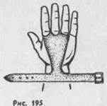 роткой скакалки 2—3 м, длинной — 4—5м. Гантели могут быть разной формы и веса. Наиболее удобны шарообразные гантели весом 3—8 кг. Наибольшее применение — в атлетической гимнастике. Булавы — изготавливаются из древесины или частично из металла; состоят из стержня длиной 40—52 см, шейки и головки. Имеют различную форму, вес 400—500 г. Применяются для динамичных маховых упражнений в художественной и основной гимнастике. Упражнения с булавами спо- собствуют развитию мышц плечевого пояса, увеличению подвижности суставов рук и совершенствованию двигательной координации. В художественной гимнастике и для выступлений применяют более легкие булавы: теннисные мячи на стержне, «снежинки», булавы с фонариками в корпусе (светящиеся) и т. п. Помимо булав и скакалки в художественной гимнастике широко применяются (в том числе и для различных выступлений) следующие предметы: мячи, обручи, ленты, флажки, вымпела, шарфы и др. Пояс для страховки (лонжа) делают из широкой тесьмы, обшитой кожей. К концу пришивают пряжку. В двух местах прикрепляют стальные проволочные кольца, к которым с помощью карабинов присоединяются тросы (или веревки). Применяют как ручные страховочные пояса, так и подвесные. Ручным поясом удерживают исполнителя двое страхующих хватом за концы веревок. Тросы подвесной лонжи перекинуты через блоки. Щиты для метаний размером 100х 100 см крюками крепятся на гимнастической стенке. Разметка: «яблочко» диаметром 18 см (центр), затем круги 40, 60, 80 см диаметром, нанесенные на щит масляной краской, шириной 1 см. Накладка — специальное приспособление из кожи для защиты ладоней при выполнении упражнений в висах (рис. 195). Судейская указка —■ приспособление для показа оценок за выполнение упражнений: а) ручная указка; б) приспособление для показа оценок (цифры на картоне, световое табло и т. п.). В общеобразовательной школе иногда пользуются для этой цели обычной ученической тетрадью, на каждой страничке которой написаны цифры от 0 до 10 (целые и десятые).