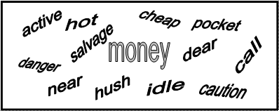 Find combinations that mean: 1. money that is being used by the public as opposed to money left in bank accounts; 2. money easily available on loan at a low rate of interest; 3. extra money or high wages paid to people working in dangerous conditions; 4. money that is difficult to borrow because of high interest rates; 5. money that is not circulated or invested and does not earn interest; 6. an item that can be easily exchanged in the way that money can, although it is not money itself. It includes cheques and postal orders but not banknotes or coins; 7. money lent on condition that it must be repaid immediately if necessary; 8. money offered by someone to show that he/she is honest and truthful and will keep to all agreed terms and conditions; 9. the reward paid by the owners of a rescued ship or goods to the person or organization that saved it/them; 10. change for small purchases; 11. money which is moved from country to country to get the best return; 12. money paid to someone in return for keeping silent about a crime.